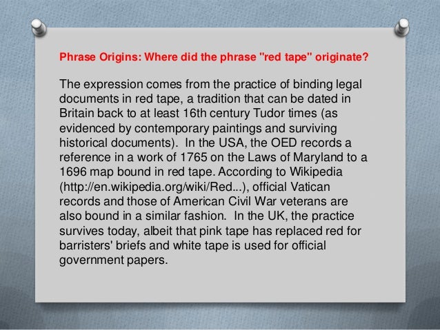 The phrase plays off red tape and tapeworm and was coined by Dickens in Household Words a weekly magazine he edited. Use the phrase red tape when youre talking about something that takes much longer than it should and involves more procedures forms or rules than make sense. Official rules and processes that seem unnecessary and delay results.